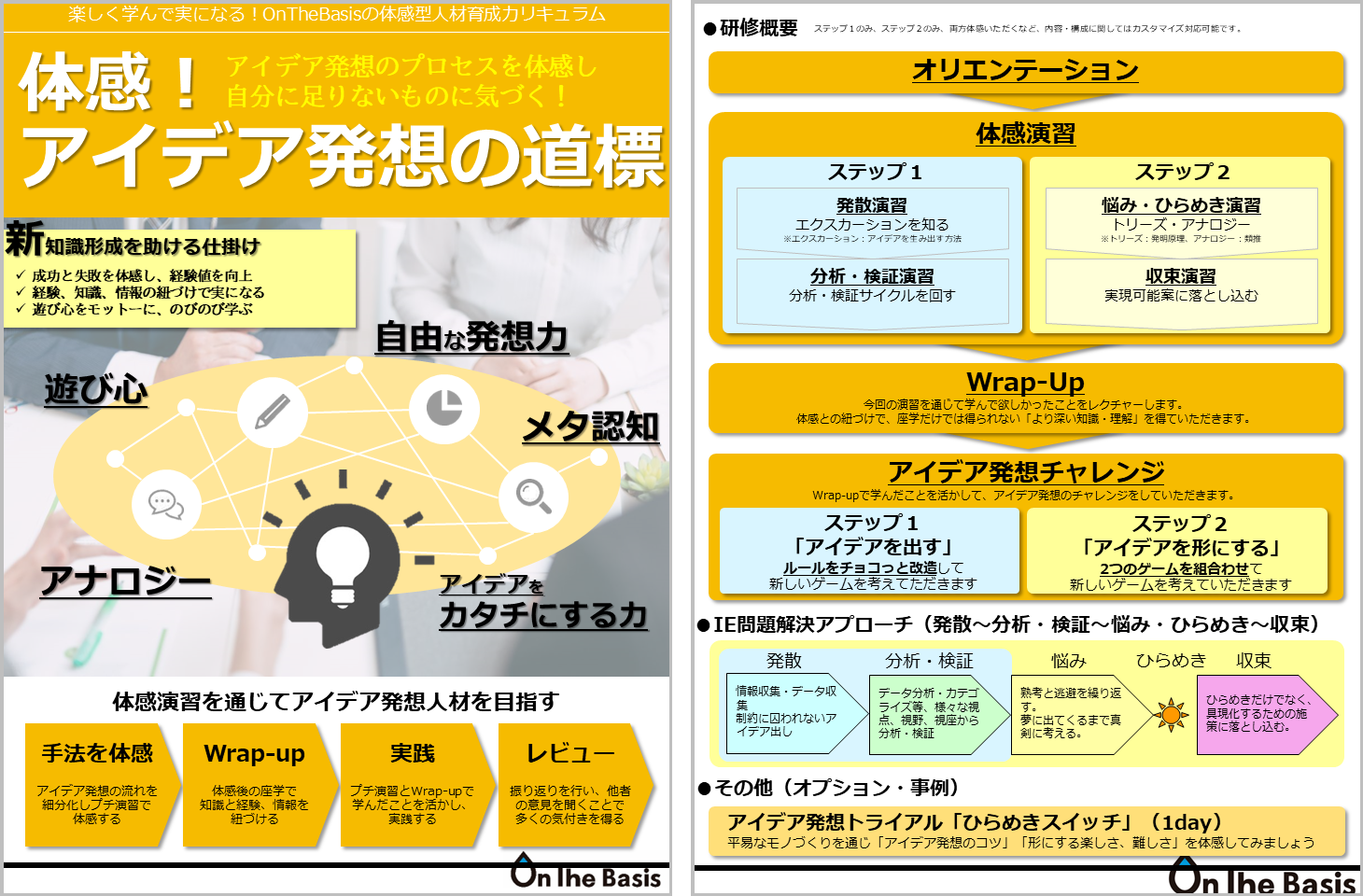 本カリキュラムは、弊社のメソッドのひとつである「IE問題解決アプローチ」を「アイデア発想」に転化させたもので、体感演習(手法の体感と実践)を通じてアイデア発想人材の育成を目指すカリキュラムです。